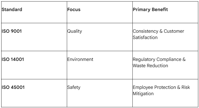 These “Big Three” are popular not just because they are often contractually required, but because they form the baseline for operational excellence in quality, environment, and safety.